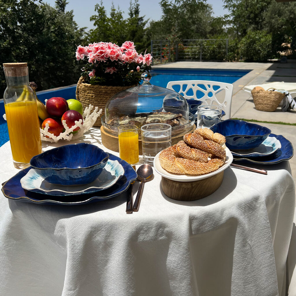 ستخرجت من خزائني مجموعة التين المحبوبة لدينا، بألوانها الزرقاء التي تتناغم بشكل مثالي مع أجواء المسبح. استخدمت وعاء المرجان الأبيض الفاتح، وهو الوعاء المثالي لفواكهنا الطازجة لاختيار الصحن المناسب للمنقوشة بالزعتر والجبن، اخترت صحن أنيس المستدير بغطائه الأنيق وبالطبع، لا يكتمل الإفطار دون عصير البرتقال، الذي قدمته في ابريقي المفضل المزين بالنقاط والأكواب المتناسقة معه.
