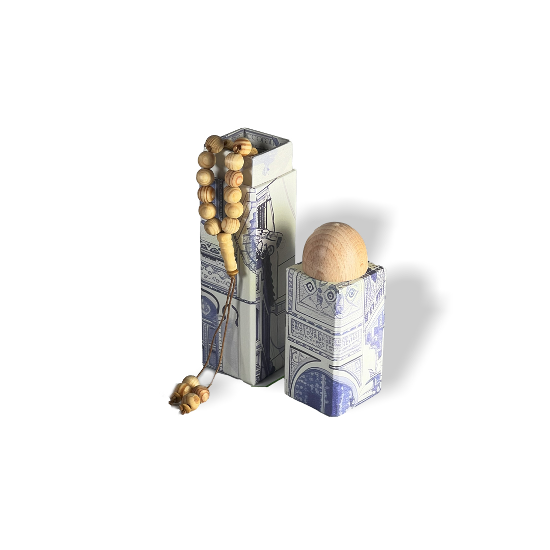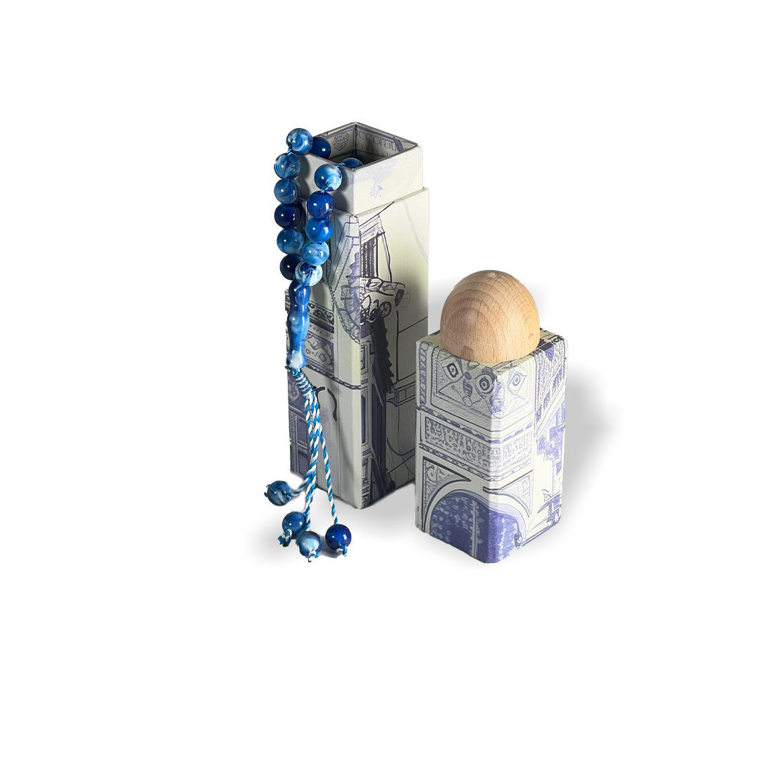صُمم هذا الصندوق الكرتوني بنمط مشهد مدينة هادئ باللون الأزرق، ويمزج بسلاسة بين التراث والجماليات المعاصرة. سواءً استُخدم للصلوات الشخصية أو كهدية مميزة، فهو خيار مثالي لمن يُقدّرون الجمال والعملية في إكسسواراتهم الدينية.