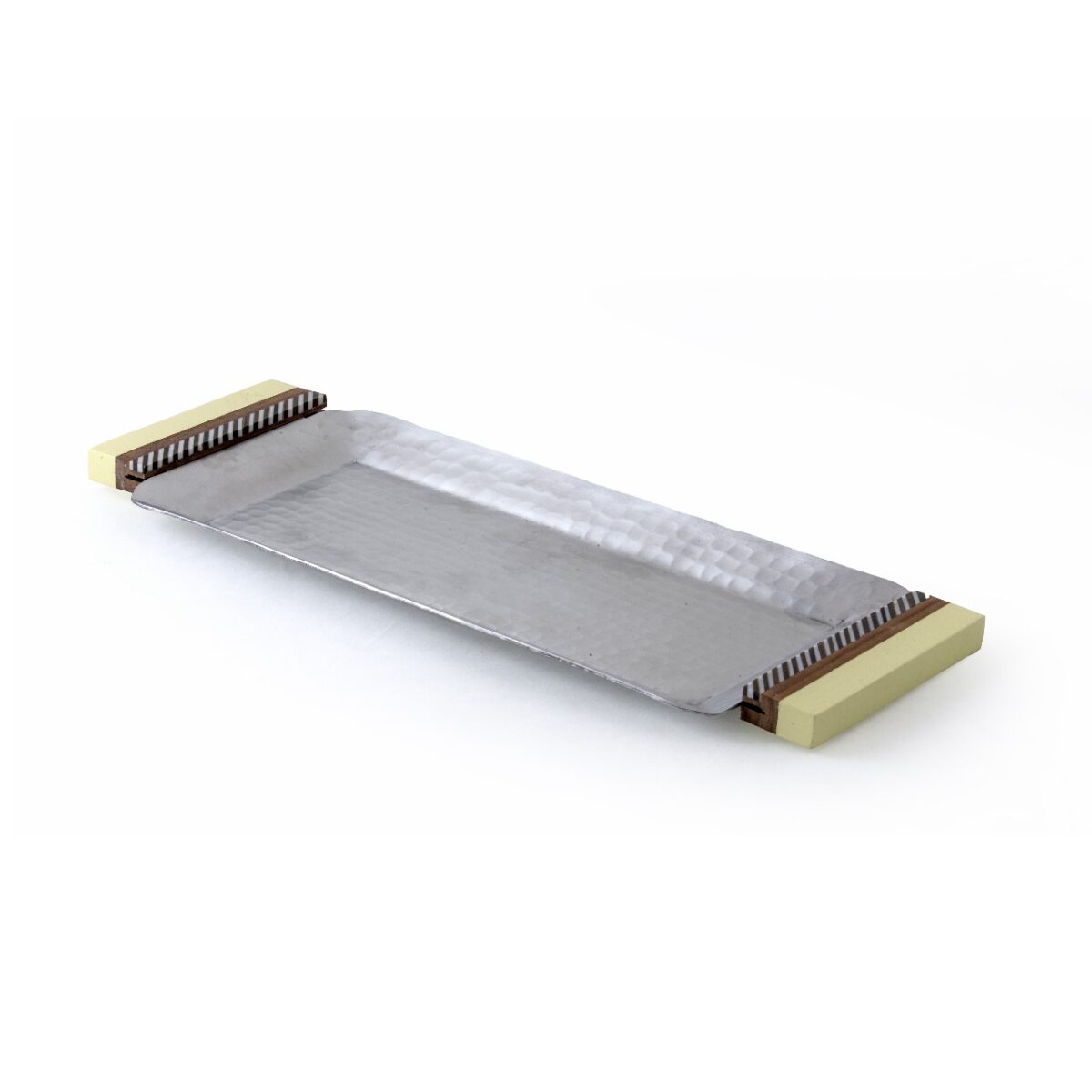 Meet the Tray Jamal in Vanilla and Camel Bone from Decoration One, a celebration of Arab craftsmanship in a contemporary tray you will reach for every day. The base is forged from hand hammered aluminum for strength, sheen, and a tactile finish that resists everyday wear; the frame arrives in four elegant colorways, walnut wood, olive green, yellow vanilla, sky blue, so you can style a cohesive Decoration One tablescape. The name Jamal pays homage to the camel, a timeless regional icon, and the tray handles echo that story through a checkered inlay of camel bone and black resin, a meticulous technique seen in Damascene furniture and fine woodwork across the Arab region.